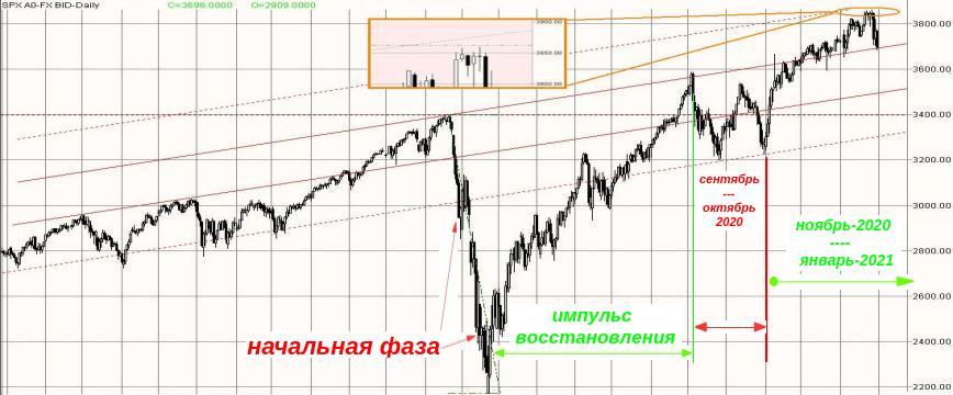 Возвратный импульс перебил уровни начала мартовского обвала ещё в течение августа (что вобщем-то не было удивительно в условиях монетарного бешенства мировых центробанков), но его максимум неплохо вписался в границы восходящего канала. Далее практически весь сентябрь и вторую половину октября на мировых финансовых рынках наблюдалось падение, наметившее предпосылки для формирования серьёзного разворота рынков - объективно вторая фаза обрушения мировой экономики могла начаться уже тогда. Но в начале ноября началось мощное ралли, которое один из аналитиков метко охарактеризовал как "ралли на костях экономики". Объективных предпосылок для этого ралли не было - ни частичное восстановление после весенних суицидных локдаунов, ни вал оптимистичных новостей о разработке кучи анти-ковидных вакцин, ни что-то ещё не могло быть причиной для столь сильного импульса вверх. Практически за одну неделю ноября рынки отыграли всю коррекцию предыдущих двух месяцев. Поэтому есть все основания предполагать, что "ралли на костях" имело искуственное происхождение. Возможно, когда-нибудь рукотворный старт этого ралли станет достоянием гласности, возможно нет - но слишком много признаков указывает на то, что ведущие центробанки в начале ноября сделали мировой экономике очередную крупную инъекцию, предназначенную для удержания пузырей на фондовом и долговом рынках. Ведь им тоже хорошо было видно формирование разворотной фигуры в сентябре-октябре, соответственно финансовые элитки вполне могли поставить себе задачу предотвратить развитие негативных с их точки зрения тенденций.